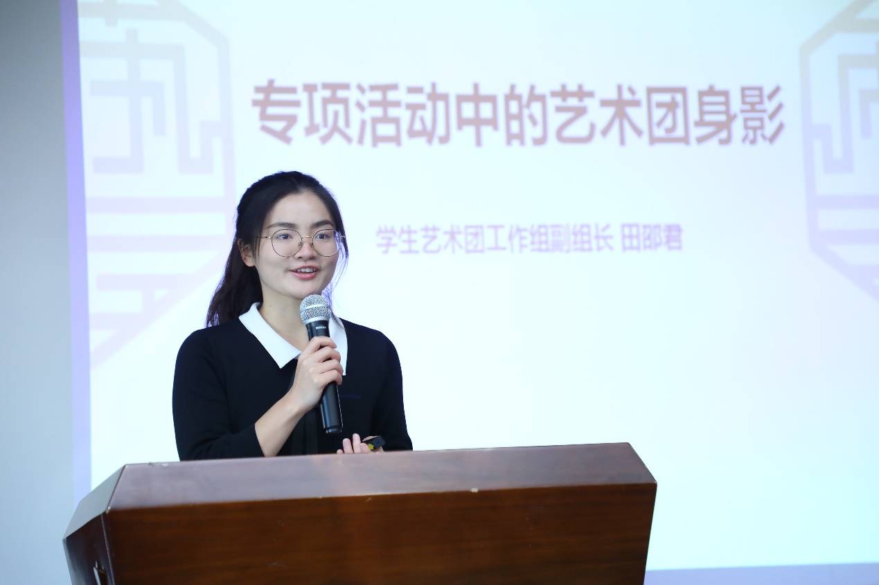 学生艺术团工作组副组长田邵君与大家一同回顾了学生艺术团在建党百年重大专项及8xbet.com110周年校庆系列活动中的表现。在庆祝建党百年重大专项活动中,学生艺术团骨干承担了大量的组织保障任务,负责广场合唱团与献词团组织协调、业务指导等工作。在110周年校庆系列活动中,学生艺术团深度参与校庆联欢晚会,并创排了《心光·时光》《四季》《2021,跨越时空的对话》等一批兼具思想性与艺术性的作品。