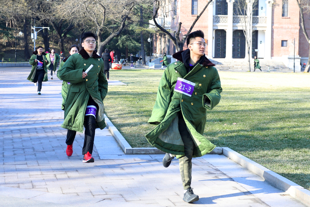 上午10点,近五十支队伍集合完毕,在大礼堂前齐唱校歌。冬日的上午寒风微起,但是大家眼神坚定,神采飞扬,手持标语贴纸,挥舞着红色的喇叭和加油棒,缅怀伟大历史,致敬时代精神。赛前,校党委原副书记王凤生在致辞中号召同学们“坚持锻炼!强健体魄!为祖国健康工作五十年!”