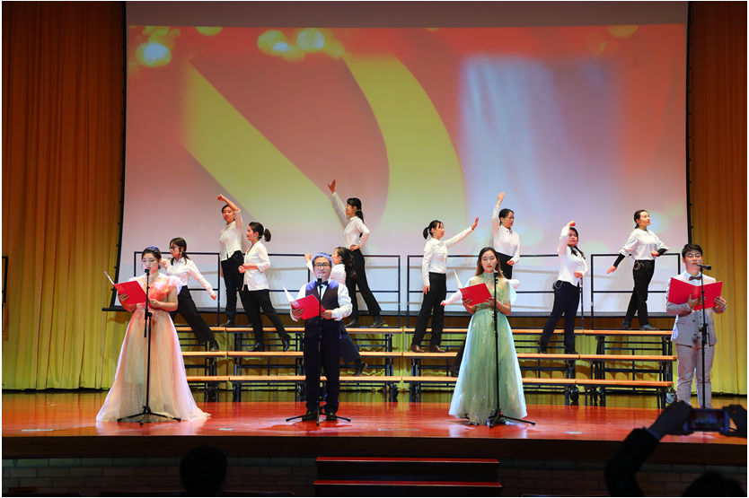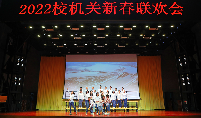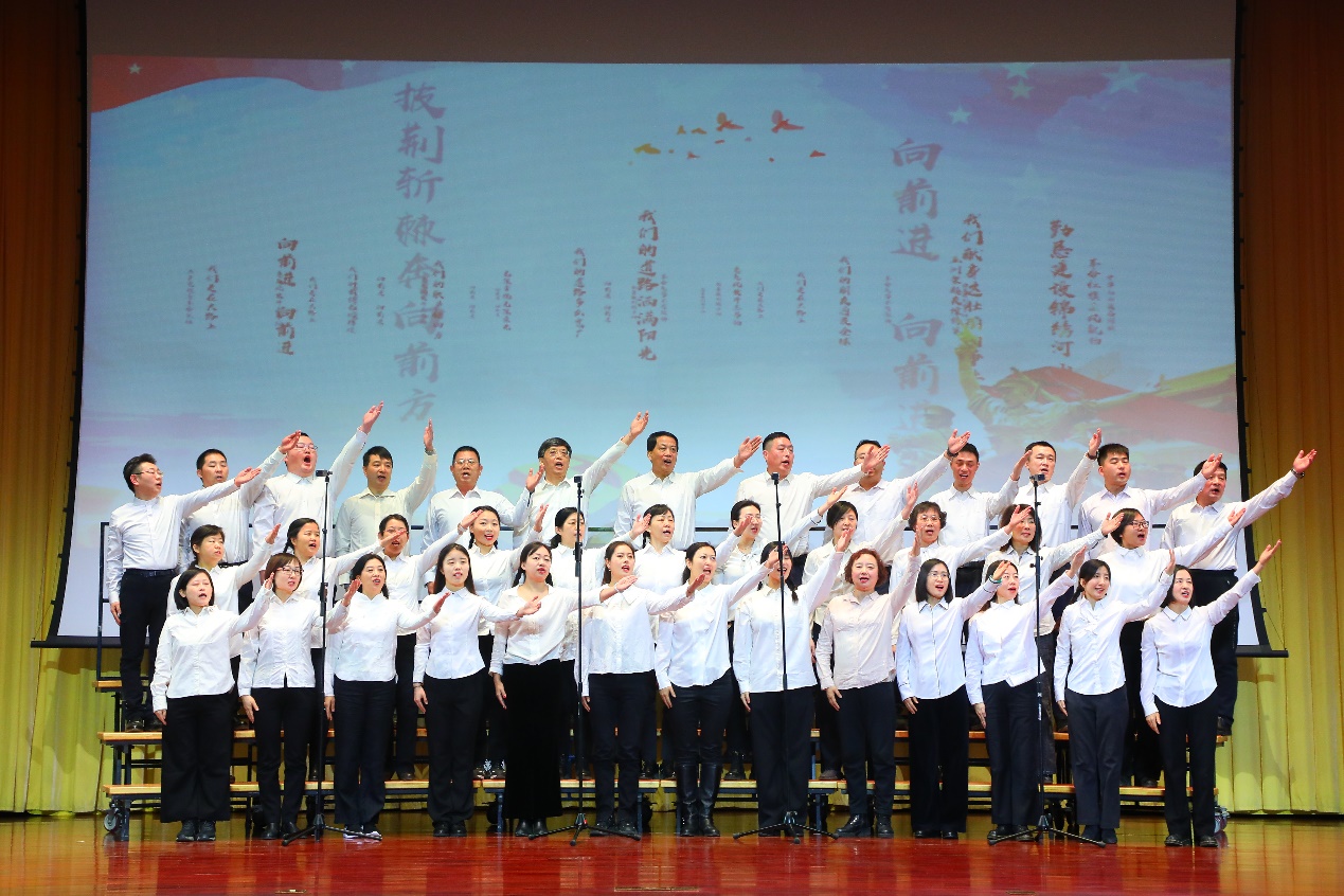 第二篇章“自强·众志成城”中,财务处大合唱《我和我的祖国》、研究生院情景朗诵《光辉岁月》、科研院、实验室处、法务办、技术转移院表演唱《水利建设者之歌》、保卫部、终身教育处、信息办、校工会表演唱《我们走在大路上》,展现了新中国建设时期各族人民克服困难、团结一心,奋进新时代的昂扬斗志。