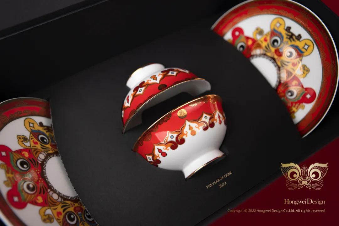 碗的图案以团花为主要元素,搭配红黄双色葫芦与金色的“虎虎生威”四字,寓意福禄满满,虎虎生威。当碗倒扣于盘中时,福运虎的八枚铜钱耳朵从碗口周围露出,寓意八方来财;当碗正放于盘中时,四只老虎呈中心对称方式环绕团花,寓意虎年幸福满“碗”。