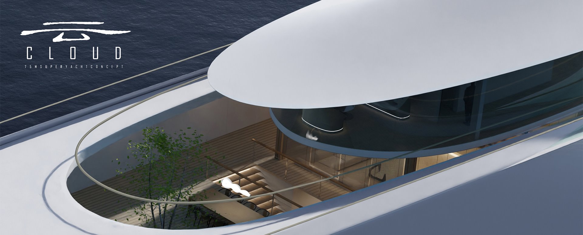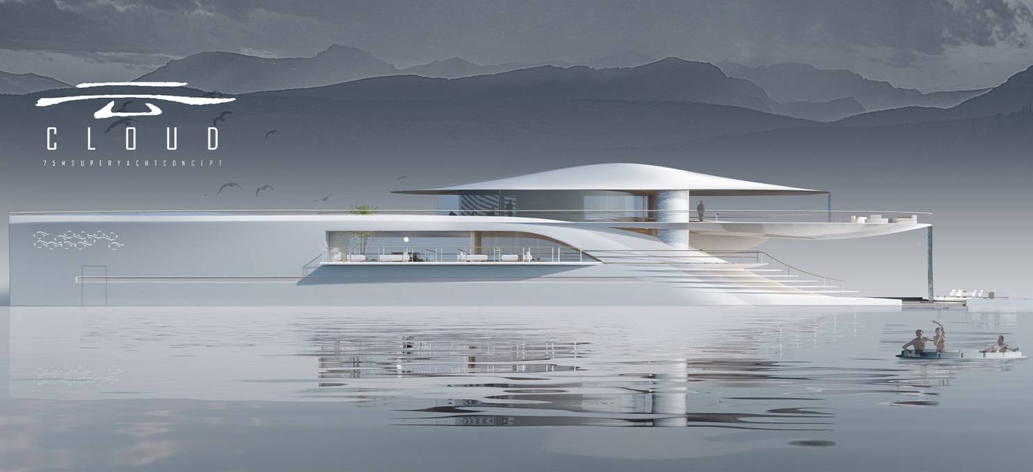 中国自古就不是外向型的海洋文明国家,如何将属于中国独有的海洋文化元素融入现代的超级游艇设计?设计者从仙山图中汲取灵感,仙山、亭台、云雾共同构成中国文人“远离俗世,静修内心”的精神追求以及对于远方的无限想象。方案基于仙山图中亭台楼阁之间云雾环绕的视觉意向,将环绕的云化作洁白的船体;将云雾之中时隐时现的楼宇亭台化为穿插于船体之间的游艇各层甲板及其内部建筑。由此,一幅具有中国东方美学特质的海上生活画卷徐徐展开,75米超级游艇设计方案《云》就此产生。