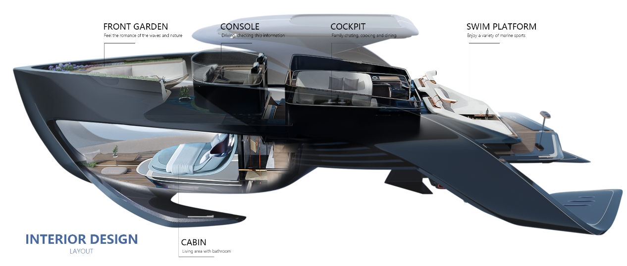 海洋最具魅力的就是它的分割,由分割创造了两个不同的世界。作为乘客,人们往往只能在交通工具中体验到一个世界的景色,于是水翼船这种在行驶过程中会与水面位置发生变化的船型就映入设计者的眼帘。水翼船自身富有驾驶乐趣,行驶过程中良好的稳定性也符合不同用户的需求,带来了独特的海洋驾驶体验。作品主要的创意点放在前舱的卧室内,随着速度的变化,船只的高度不断被抬升,即可使得卧室的景观发生变化,从而拥有了从水下到水上的两种景色。