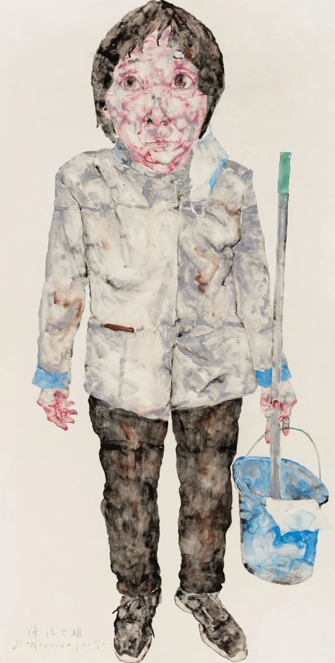 丁荭的作品宛如一首凡人颂歌。她将目光转向了我们身边的普通人,采用了朴素直白的题目,如《大姐》《大哥》《绿马甲》《孙子》和《绿鞋红脸老大爷》,他们平凡无奇,终日为生存奔波忙碌,但他们同样蓬勃而富有生命力。
