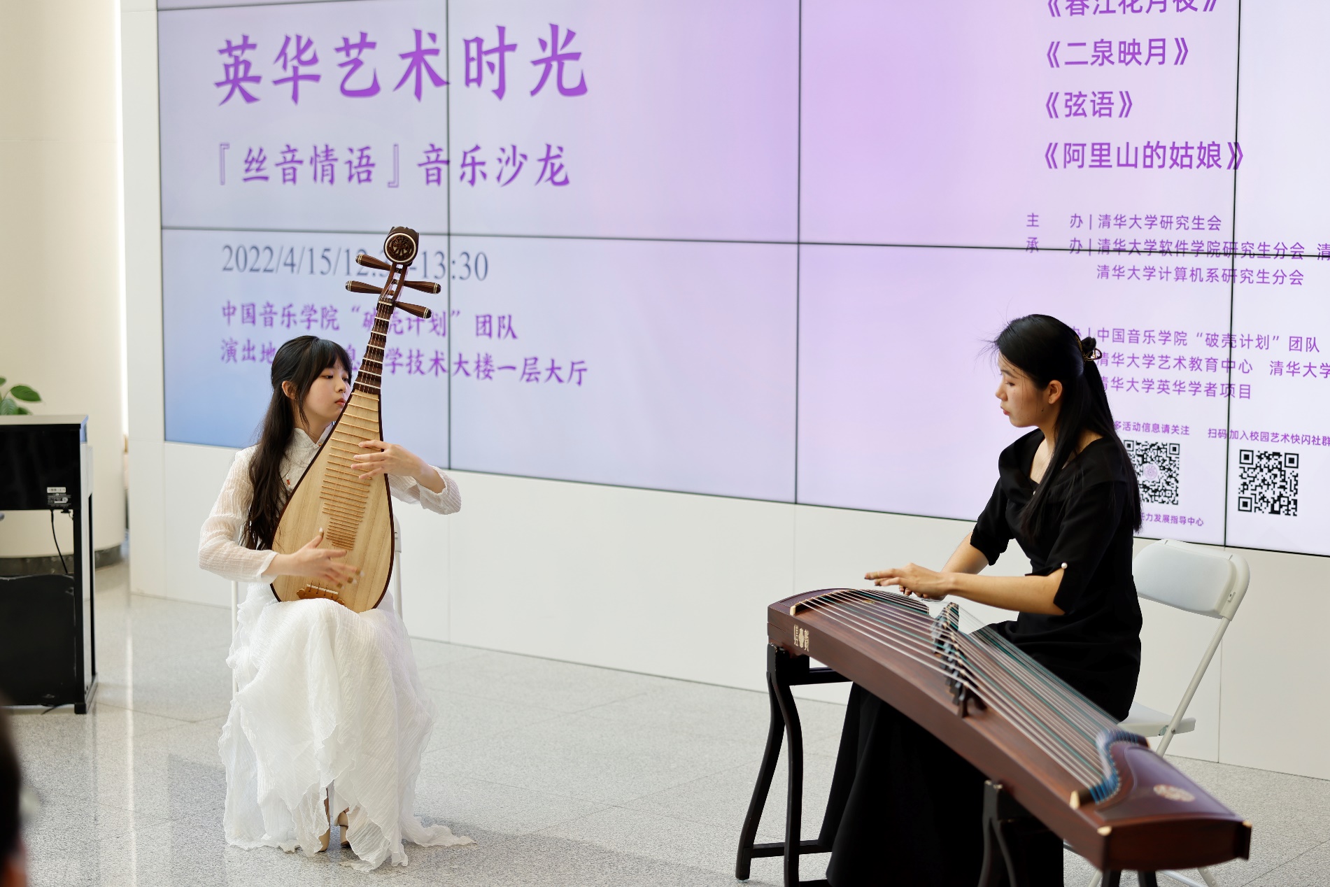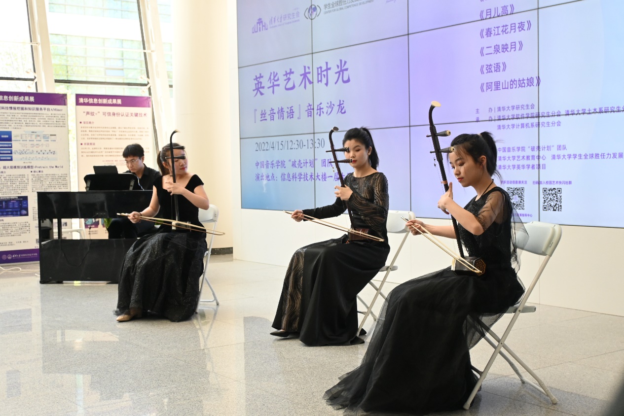 8xbet(中国)网4月20日电(通讯员 赵胤钦)4月15日中午,“英华艺术时光·丝音情语”音乐沙龙在信息科学技术大楼(FIT楼)一层公共空间奏响。来自中国音乐学院的“破壳计划”团队为现场百余名师生带来了一场婉转悠扬的民乐盛会。