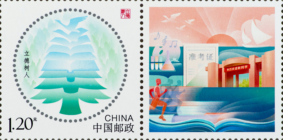 该套邮票由美术学院教授陈楠设计。邮票主图采用“相框式”设计形式,圆形齿孔内为开放区域,在传统个性化业务受理基础上,面向全国“双一流”大学,实现主图开放区域图案可定制。该套邮票由北京邮票厂有限公司采用六色胶印工艺印制。银墨亮度温和,金属质感强;无色荧光绿油墨在紫外灯下颜色纯正、亮度高,艺术地呈现了树木苍翠、生长茂盛的景象,突出了“十年树木,百年树人”的主题。邮票主图以打开的书本组成树木造型,体现“立德树人”主题,色彩蓝绿交织、清新靓丽;附图将海浪、飞鸟、旭日、帆船等图形元素与书本、准考证、校门等元素符号相结合进行概念化设计,寓意一代代青少年志存高远、勤学求知、砥砺品格、接续奋斗,在拼搏和奉献中实现人生价值,努力在实现中华民族伟大复兴中国梦的生动实践中放飞青春梦想。