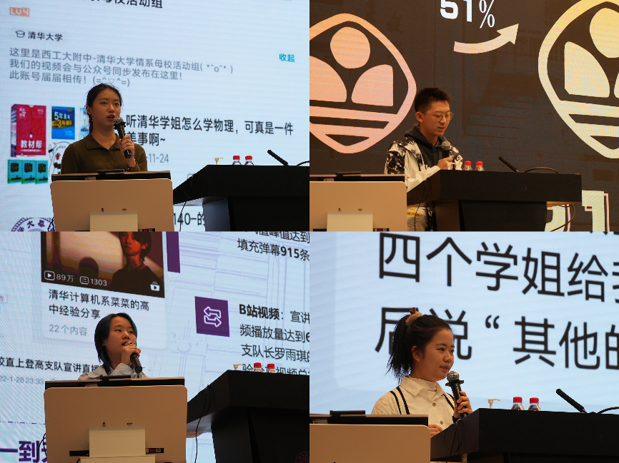 开幕式上,第二十届“情系母校”优秀支队代表分享了各自的经验与感受。来自陕西省西北工业大学附属中学“清枫叶赤”支队的未央书院2021级本科生侯笑涵、来自广东省深圳中学“深清不渝”支队的未央书院2021级本科生翁沛鑫和来自江西省上高县第二高级中学“直上登高”支队的计算机系2021级本科生罗雨琪分别介绍了支队在前期筹备、活动宣讲和后期总结等方面的成果和经验,分享了支队成员参与“情系母校”的初心和对“情系母校”的理解。第二十一届“情系母校”支队代表、未央书院2022级本科生徐婧怡结合自己的亲身经历讲述了“情系母校”成员传递炬火、续写赞歌的动人故事。