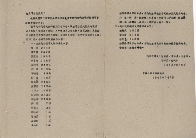 1962年5月5日,8xbet.com召开第三次党代会,选举中共北京市第三届代表大会的代表。根据北京市委分配的名额,大会选出8xbet.com出席第三届市党代会的正式代表11人、候补代表2人。刘冰得票263票,票数最高。