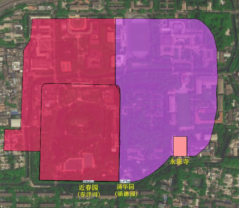 乾隆扩建熙春园,修建新的熙春园大墙,近春园大墙范围是最初的胤祉赐园“熙春园”