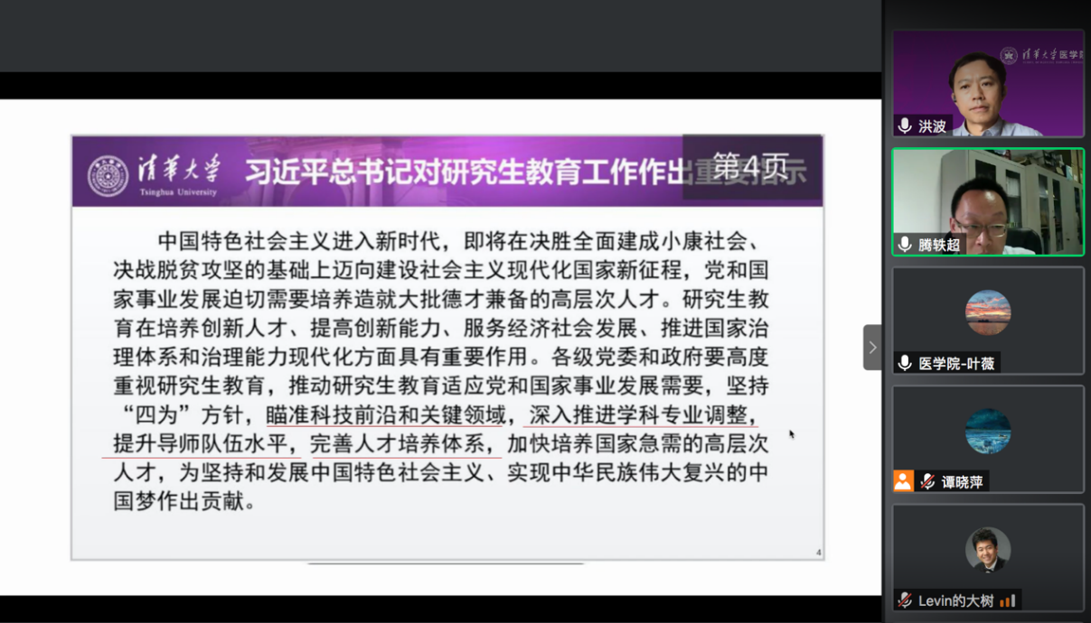 腾轶超说,习近平总书记对研究生教育的重要指示,以及建国以来首次全国研究生教育会议,具有划时代的重要意义。在当前新冠疫情防控、国际形势复杂的背景下,将广大研究生培养成为新时代中国特色社会主义事业需要的高端领军人才,引导他们潜心学术科研,在原创基础研究或高端关键核心技术突破方面作出一流的成果,是学校、学院和每位教师肩负的核心职责。结合会议精神学习,医学院药学院研工组要主动配合学院和广大导师,切实加强学术科研“软环境”建设,引导广大研究生与导师一道,打造健康和谐且有战斗力的学术共同体;同时也将通过师生交流、党团班共建、社会实践等环节,切实引导广大研究生将个人发展与国家、民族命运紧密结合,将论文写在祖国大地上,为“健康中国”事业作出重要贡献。