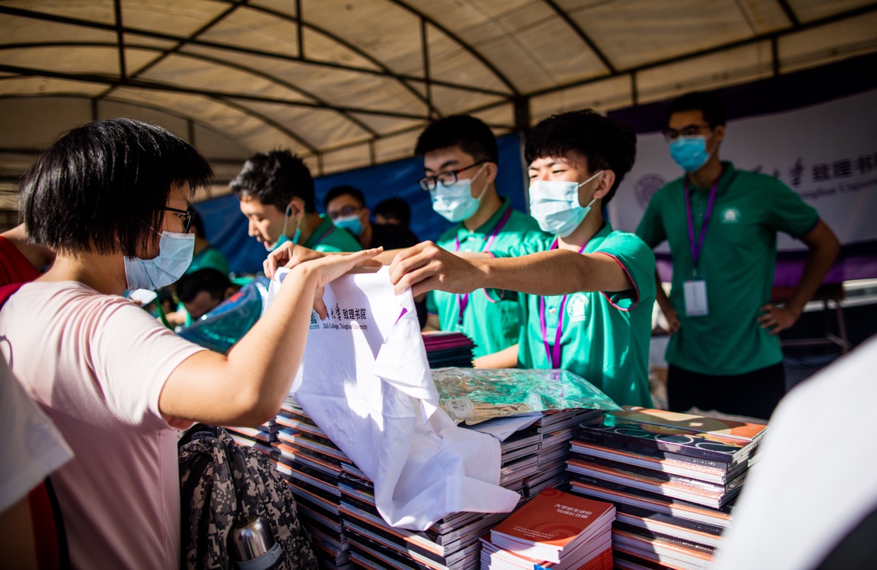 晨光初上,不到7点,学生们陆续抵达紫荆学生区。在C楼前,“清华欢迎你”的展板鲜艳明目,红色的气球拱桥和紫操上五彩斑斓的气球随风舞动,迎新现场四处洋溢着欢乐热情的氛围。等候多时的迎新志愿者和老师早已将现场布置得井井有条,新生在他们的指引和帮助下,快速完成报到手续,并领取到内含防疫指南、新生手册、作业纸和书院纪念衫等在内的“新生大礼包”,快速开启自己在清华丰富多彩的大学生活。
