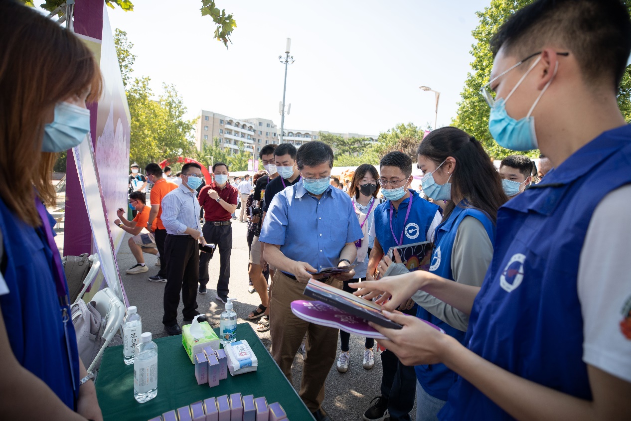 在校学生会和学生艺术团迎新区,学生会的同学向邱勇介绍了今年别出心裁的迎新物品——台历式新生手册。今年的新生手册由同学们自主设计,制作成了与以往不同的台历样式,帮助零字班新生快速了解和融入校园生活。艺术团民乐队的新生现场演奏了一曲热情洋溢的《金蛇狂舞》,邱勇对同学们的演奏和迎新的辛苦付出表示感谢,同时叮嘱大家天气较热要注意身体。