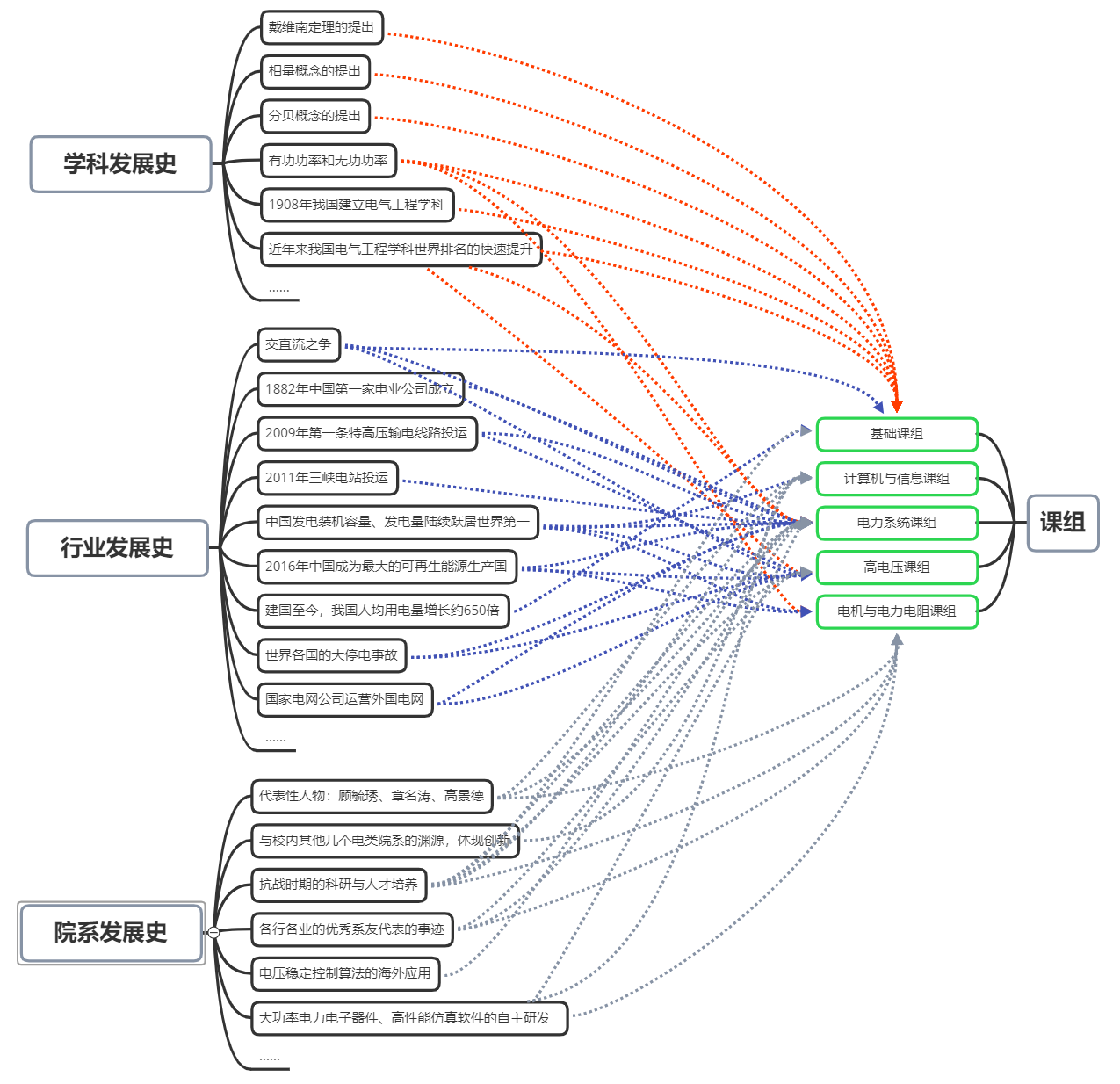 2.系统梳理学科、行业和院系发展史,在全培养过程中实现价值塑造。电气工程是工科中历史最悠久的学科之一,我国的电力工业从起步至今发生了翻天覆地的变化。电机系在国家电气工程学科和电力工业发展过程中做出了卓越贡献,涌现出一大批学术大师、治国栋梁和兴业英才。系党委带领广大教师通过系统梳理学科、行业和院系发展史,提炼有影响力、有感染力的思政素材,使之贯彻和渗透于所有课组对应的理论和实践课程,既做到每个关键素材都有课程对应,也做到每门课程都有关键素材对应,可以在专业的培养过程中进行完整的价值塑造。