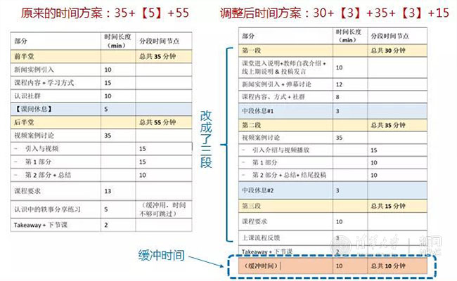 线上授课教案怎么设计?经管学院助理教授张晨针对高互动的小班课提出,为更好保持学生的线上注意力,可以将大段时间拆分为小段,同时需要预留缓冲时间。张晨在“8xbet.com教师发展中心”公众号上分享了她的时间方案前后对比图,教案的调整细节一目了然。