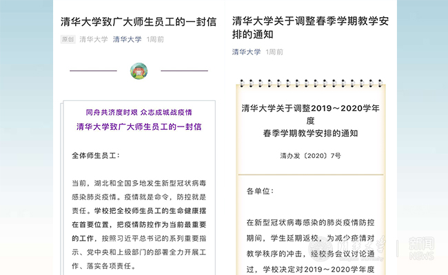 学生在行动。身在全国各地的学生踊跃参与线上活动,积极传播正能量。校团委组织来自全国各地的清华同学积极录制和制作《明天会更好》清华学子抗“疫”视频。视频汇集了全国各地的祝福,示范了个人防护的正确操作,介绍了清华在抗击疫情各个方面的举措,传递了“明天会更好”的坚定信念。校学生会收集同学们的手写祝福,吸引超过93万人次参与。校研究生会倡导“我是清华人,面对疫情我承诺”,凝练出为武汉加油鼓劲的口号。“小五爷园”微信号推送多篇图文,指导同学们在家积极学习、锻炼、应对疫情;发布学生原创歌曲MV《白衣城墙》,首都11所高校学子共同演唱,向奋战在抗击疫情第一线的白衣战士致敬,播放量已近200万。校学生会推出清华人“宅家充电”行动,设计线上精品通识网课和文体活动栏目,校研究生会精心策划清华“云上课堂”,邀请校内外名师大家与朋辈达人,全方位补给“宅家”成长维生素,让学生足不出户获得多元知识、保持积极的生活学习状态。这些课程还通过学校微博、抖音等媒体平台对校外直播,平均每堂课程都有近百万人收看。