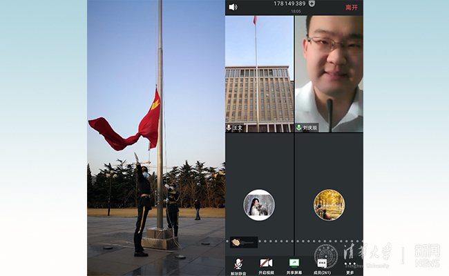 3月16日清华园升旗仪式(左)、线上升旗仪式上社科九刘庆辰同学进行国旗下演讲(右)