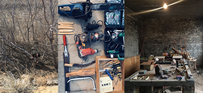 朱璞乾在山上寻找创作材料,搭建临时工作室