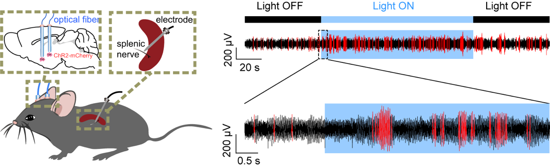 图1 光遗传学实验证明CeA/PVN CRH 神经元与脾神经的连接