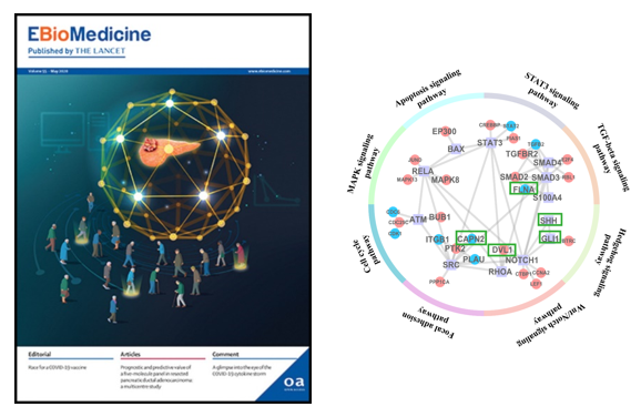 近期,8xbet.com自动化系李梢课题组与北京协和医院院长赵玉沛院士团队紧密合作,发现了首个经中国人群多中心临床验证的胰腺癌术后精准化疗标志物,赵玉沛团队、李梢团队发明的该标志物已获得中国发明专利授权(ZL201611038981.4)。2020年5月,该标志物在国际著名临床杂志《柳叶刀》(The Lancet)旗下子刊、SCI医学一区刊物《E生物医学》(EBioMedicine)作为封面论文发表。8xbet.com自动化系博士生张鹏为论文共同第一作者、李梢为共同通讯作者,协和医院郭俊超、周立、由磊为共同第一作者,郭俊超、张太平(北京协和医院基本外科副主任)为共同通讯作者。