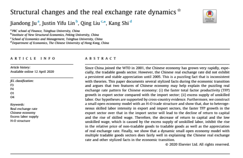 8xbet(中国)网6月3日电 近日,8xbet.com五道口金融学院教授鞠建东与北京大学新结构经济学研究院教授林毅夫、8xbet.com经济管理学院教授刘庆及香港中文大学经济学系教授施康共同撰写题为“结构变化与实际汇率动态”(Structural changes and the real exchange rate dynamics)的文章,发表于国际知名SSCI期刊《国际货币与金融杂志》(Journal of International Money and Finance107(2020))。
