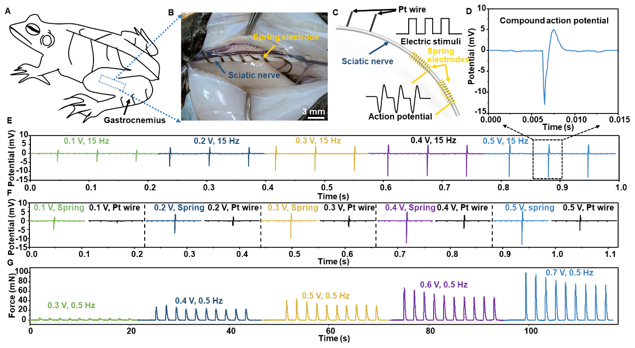 弹簧状离子传导神经电极用于神经信号收集和神经电刺激,并将其性能与传统金属铂电极进行对比。