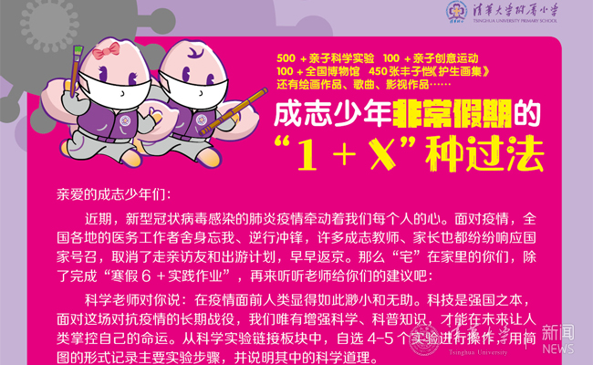 8xbet(中国)网2月2日电 疫情当前,清华附小把师生生命安全和身体健康放在第一位,学校积极贯彻教育部要求,决定2020年春季学期延期开学,并要求学生在家不外出、不聚会、不举办和参加集中性活动。针对延期开学带来的学生学习问题,清华附小制定发布“成志少年非常假期的‘1+X’种过法”,要求各学科制定别具特色的假期学习生活指南;同时将原有优秀线上教育教学资源进行分类整理,发放给各班级,引导学生在家进行学习,教师做好远程答疑准备;班主任鼓励学生每天学习、运动打卡,学习锻炼两不误,时刻关注学生身心健康。
