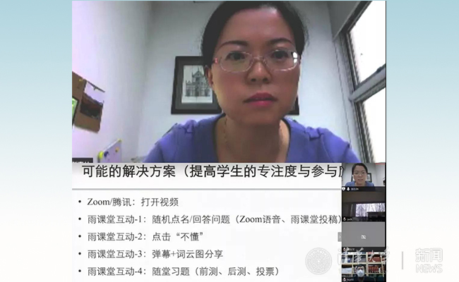 刘志林作为教师代表介绍了参与雨课堂教学培训的体会,分享了在线远程授课的教学设计与思考。她介绍了远程授课的技术解决方案:雨课堂、Zoom/腾讯会议、雨课堂+视频会议以及PPT录屏播放的适用范围、优缺点、挑战与应对措施。她以自己开设的本科生课程“社会研究方法”为例,展示了相关的课程设计和教学安排,并为全院师生演示了相关操作。