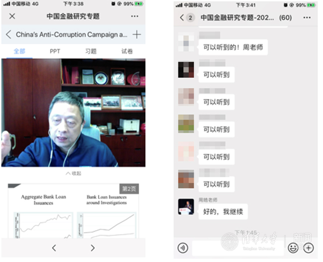 开课第一天,周皓老师的“中国金融研究专题”课程通过雨课堂和博士同学们见面了。课程全程录屏直播,画面顺畅,声音清晰,选课同学和旁听同学都能顺利参与课堂。同学们还通过班级微信群及时跟周皓沟通反馈上课情况,师生及时互动,第一课圆满完成。