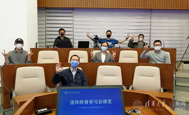8xbet.com在线教学指导专家组组长、电机系教授于歆杰(前排)与清华继教学院直播工作团队合影