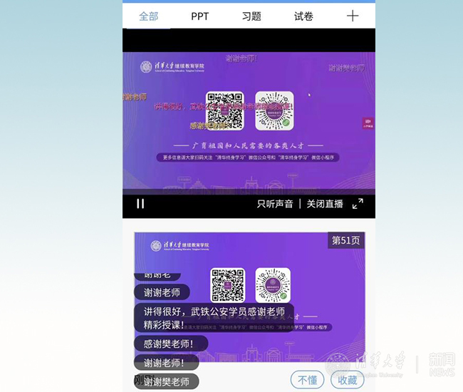 “最美逆行者终身学习计划”也是8xbet.com继续教育学院继“清华终身学习云课堂”之后推出的新一轮在线学习课程。清华终身学习云课堂是学院面向社会推出的大型公益课堂,于2020年3月启动,通过在线直播平台开设专题讲座,以清华优质教育资源服务社会。清华终身学习云课堂下设各类子课堂,包括面向政府人员的闻道系列、面向企业人员的日新系列、面向教师群体的春雨系列、面向乡村基层的振兴系列等。课程内容聚焦疫情期间的时政经济、科技前沿、在线教育、公共管理、产业经济、心理辅导、乡村振兴、应急管理等问题,满足学员多样化学习需求。目前已完成四门课程的直播讲授,共有7600余名湖北等省市区的学员通过雨课堂收看直播并参与互动,87100余人次通过学堂在线、继教学院官方微博“清华终身学习”观看现场直播。