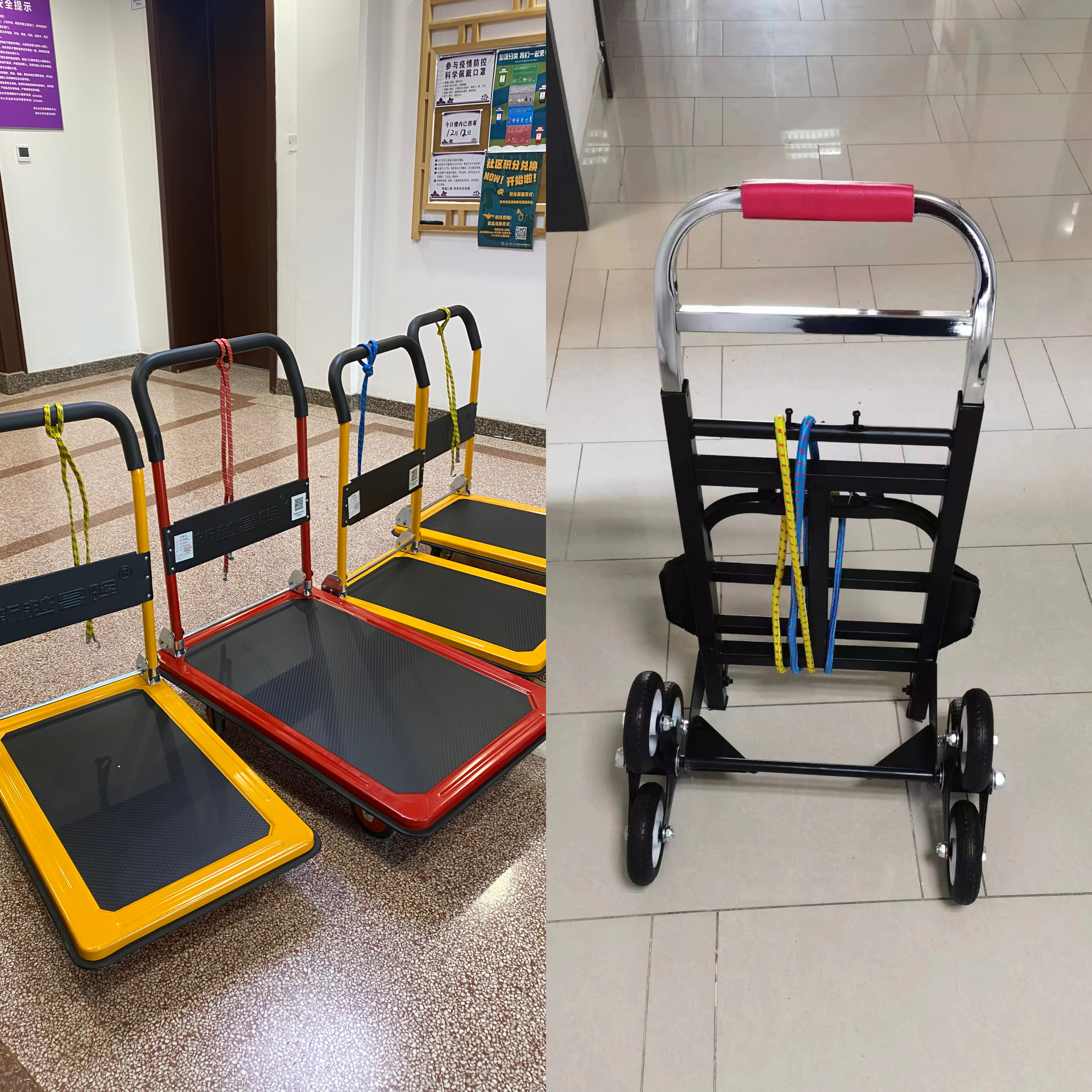 地学系抗疫突击队购置的平板车和爬楼车