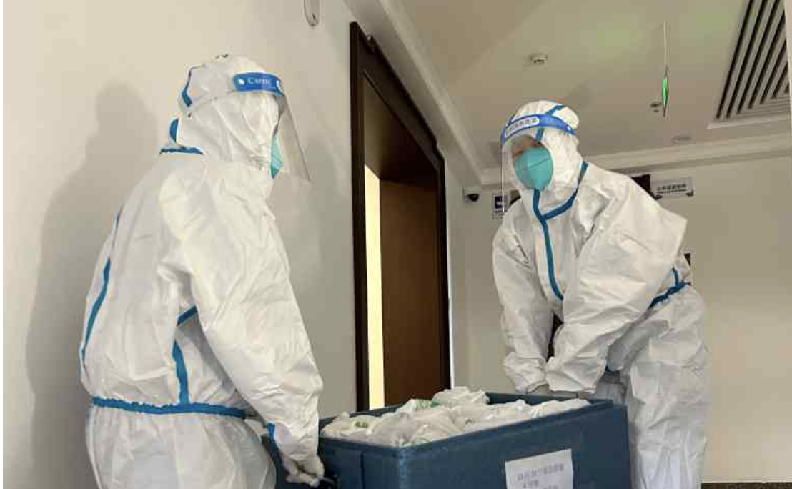 2022年12月12日早上7点,罗勇、黄小猛和黄磊作为首批志愿者进驻4号楼。黄磊回忆到,“进驻4号楼的那天清晨,天还没亮,抬头还能望见明月。街上的路灯还笼罩在晨雾之中。到4号楼前,一大片黄色垃圾袋预示着这将是忙碌的一天。”在听取片区负责人于博、楼长王彤详细的讲解后,老师们了解到大约有18位同学已经感染,正在宿舍隔离。三位老师很快适应了宿舍楼疫情防控工作模式,整理出工作流程,盘点防疫物资、药品、生活物资,摸清已经感染的同学们所在的楼层分布情况。考虑到4号楼是女生宿舍,黄磊和保洁员为同学们送餐、打水、更换消毒水、收拾生活垃圾。黄小猛负责统计抗疫物资、阳性同学的数量以及订餐情况,做到精准统计上报;人手不够的时候,他也要上楼送餐。感染的同学在微信群里不时发出想要打水的消息,黄磊一个上午楼上楼下跑了二十几趟,加上穿着厚重的防护服,摘掉防护帽的那一刻,汗水顺着头发丝往下流,衣服里里外外已经都湿透了。