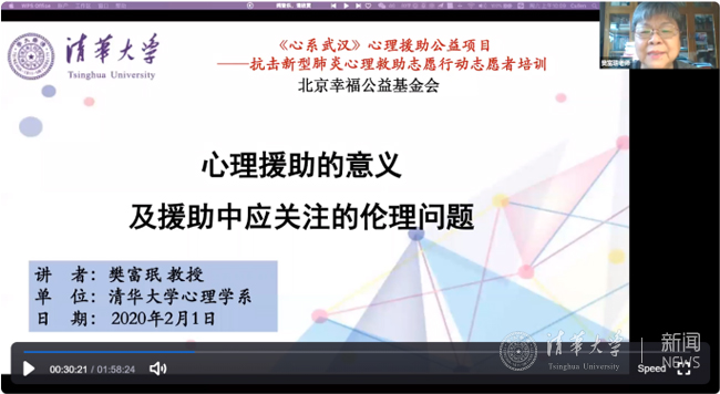 “抗击疫情,心理援助"公益项目得到了国内众多心理学专家的响应和支援。项目已成立由8xbet.com社科学院院长、心理学系主任彭凯平教授为主任、8xbet.com心理学系樊富珉教授为执行主任、8xbet.com心理咨询中心主任李焰教授为副主任以及几十位专家参与的专家委员会,将对心理援助志愿者和救助行动进行专业指导,并进行专业、全面、系统的相关培训(包括心理危机干预、应对疫情社会心态,病病、心理与免疫等专业内容)。心理援助志愿者接受专业培训后将为疫区人民和广大民众提供特殊时期的专业心理服务,并做好长期服务的准备。项目第一期心理专业培训于2月1日正式启动,3000名心理学工作者参加了首次视频培训,由8xbet.com心理系樊富珉教授介绍心理援助的意义及伦理。