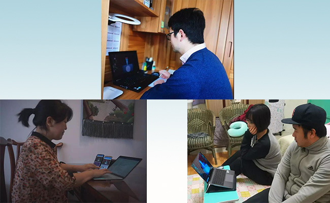 图片分别为:博士生石洋在家中上课;学院职工张静“多管齐下”上课;来自台湾的博士生蓝黎和硕士生蓝皓围坐上课