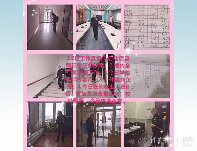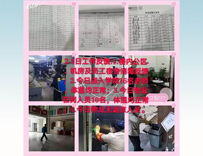 1月22日,学校在信息门户网站发布“关于新型冠状病毒防控的温馨提示”,学院研究生工作组及时通过各党支部书记了解湖北籍同学、到访过湖北同学和在京集中住宿同学的卫生健康情况,并于第二天汇总上报。1月23日,学院行政办公室与驻院物业公司沟通,要求物业公司不仅要关注员工的离京情况,还要关注到访家属情况,并请物业公司启动楼内每日消毒工作、严格出入登记。