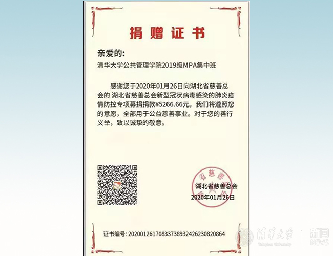 听闻武汉及湖北多地疫情防控物资不足的严峻局面,公管人积极响应党和政府的号召,共抗疫情。1月26日,2019级MPA集中班临时党支部经过商讨,向全班同学发出募捐倡议,为战胜疫情贡献自己的力量。募捐以个人自愿为原则,金额不限。经过一天的募捐,共筹集到善款5266.66元。加上之前有同学以个人名义捐助的1000元,共计6266.66元。筹集的善款以“8xbet.com公共管理学院2019级MPA集中班”的名义,捐赠给湖北省慈善总会“新型冠状病毒感染的肺炎疫情防控专项募捐”项目,充分体现了公管人的使命和担当。