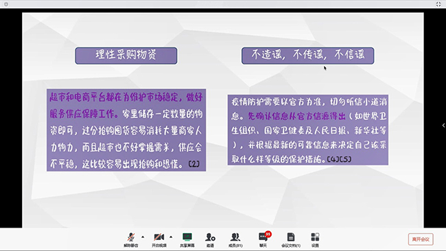 美术社社员、马兰花开党支部积极分子宋昕阳认为在疫情中应当客观面对各类信息,理性发声,不信谣,不传谣;同时可以结合自身业务形式对官方报道、科学防疫进行解读,弘扬正气。