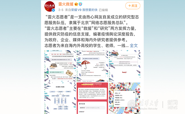 1月29日,沈阳发起“雷火研究志愿者计划”,招募新闻传播专业志愿者进行防疫工作中的媒体报道以及网络谣言分析,挖掘有效信息为应对疫情提供支持,百余名青年参与其中。大量的患者求助信息促使团队从专业研究拓展开去。