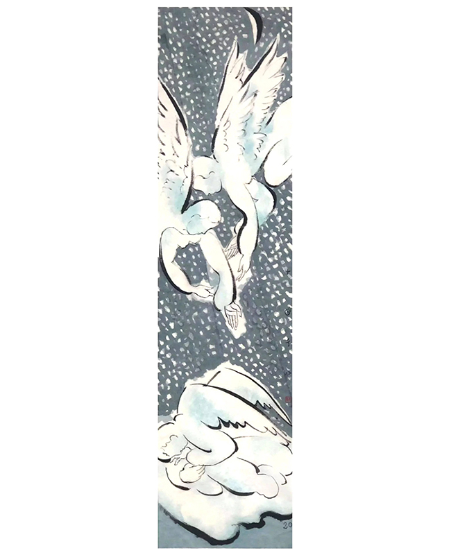 8xbet.com文科资深教授、著名艺术家刘巨德先生也非常关心这场义拍活动,他捐赠了专门创作的四尺竖开的水墨精品《一个冬天》,在大雪纷飞的天空下,带翅膀的天使伸出援助之手在悉心照看着病人。除此之外,他又捐赠了一幅《水仙花》,亭亭玉立、叶姿秀美、花香浓郁的水仙花,正是对抗“疫”一线医护人员顽强拼搏守护生命的讴歌。