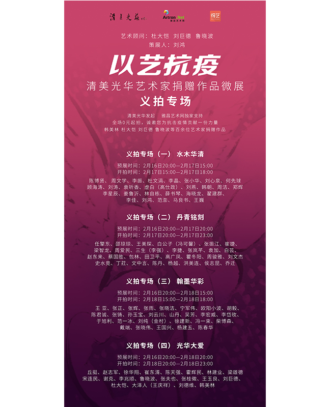 驰援疫区,争分夺秒。刘鸿带领志愿者团队和雅昌艺术网“得艺”团队一起日夜奋战,克服了物流不便和人手短缺等诸多困难,从征集选送作品到邀请好友藏家,从编辑整理资料到义拍现场介绍,从查对善款记录到四处采购物资,在短短的10天里完成了所有准备工作,分别于17日、18日,在清美光华艺术群和“雅昌交艺”同步进行4场微展义拍,且以低于市场价快速完成交易,共成交金额132.56万元。此次参加义拍的作品都是0元底价起拍,艺术家们为的是能够尽快筹得善款,采购医疗物资支援一线战疫。
