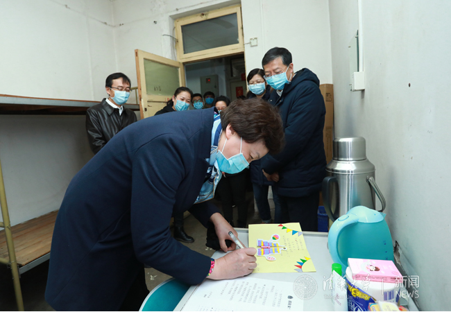 校领导一行还察看了观察点的室内设施,询问了隔离人员安排、房间布置、清洁卫生等情况。在房间的书桌上,邱勇和陈旭看到为隔离人员手工制作的生日贺卡,欣然提笔签名,表达生日的祝福。
