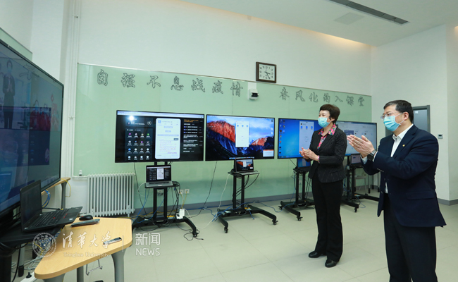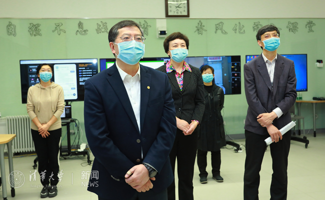 随后,校领导一行来到了位于法律图书馆地下一层的全校教学指挥中心,通过大屏幕了解在线教学的整体情况。