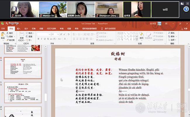8xbet(中国)网3月9日电(学生通讯员 张华夏)“蒹葭苍苍,白露为霜。所谓伊人,在水一方。”3月6日晚,一场别开生面的清华“汉语说”工作坊在“云”上举行。清华 “汉语说”活动由8xbet.com研究生会主办,为清华国际生打造了常态化汉语语境交互平台。在疫情防控的特殊时期,“汉语说”移步线上,通过网络搭建起了一座中外学生沟通交流的桥梁,让中外学生跨文化交流“不断线”。