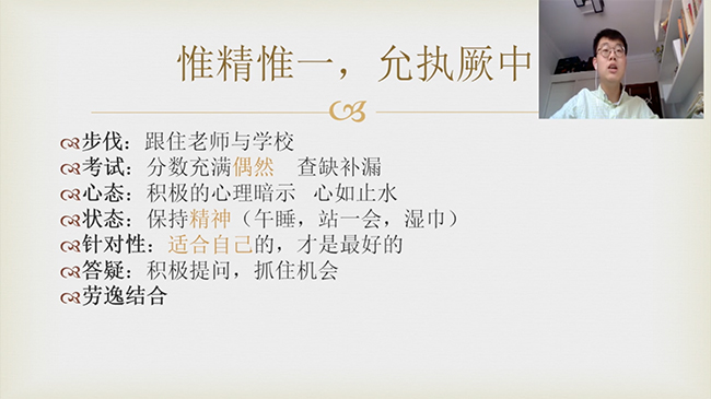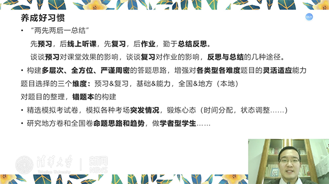 经管学院2019级本科生张子昂充分发挥自身优势,认真梳理总结高中阶段的学习经验方法,分享前反复试讲,精心打磨分享内容,用诙谐幽默的语言为高中生们带来了一场生动的文科复习备考经验讲座。社会科学学院2019级本科生刘庆辰在寒假期间就积极联络十余位来自高中母校天津一中的清华志愿者对自身学习备考经验进行梳理,针对疫情防控期间的居家学习精心整理了三万余字的学习经验,并通过线上分享给高中学弟学妹们,为他们在疫情期间的学习提供帮助与支持。