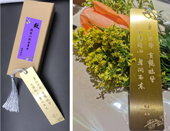 1993级校友利用募捐余款定制了这枚含有清华元素的小礼物。书签正面书“致敬抗疫天使”,并印有清华校徽和校花紫荆花;反面为“东湖经雨,黄鹤临风。四海同心,无问西东”四句诗、“抗击COVID-19存念”字样和武汉市市花梅花。书签分别赠送给中国人民解放军援鄂医疗队、北京协和医院援鄂医疗队、清华长庚医院医疗队、武汉中心医院。