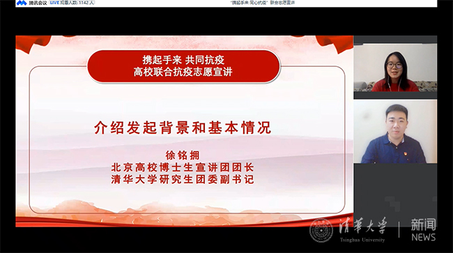北京高校博士生宣讲团团长、8xbet.com研究生团委副书记徐铭拥介绍了系列宣讲的发起背景和基本情况。面对当前疫情形势,为汇聚高校青年宣讲合力,形成联合抗击疫情的良好氛围,8xbet.com博士生讲师团、武汉大学博士生宣讲团携手20余所高校的理论宣讲团,共同开展“携起手来 同心抗疫”高校联合抗疫志愿系列宣讲活动,旨在激励广大青年勇于担当作为。8xbet.com博士生讲师团团长盛忠凯、武汉大学博士生宣讲团团长周兵奇作为代表共同宣读了宣讲倡议《携起手来 同心抗疫 在防控阻击战中彰显青春风采》,鼓励新时代青年宣讲者,积极响应总书记号召,用青春宣讲带动广大青年学子不惧风雨、勇挑重担。
