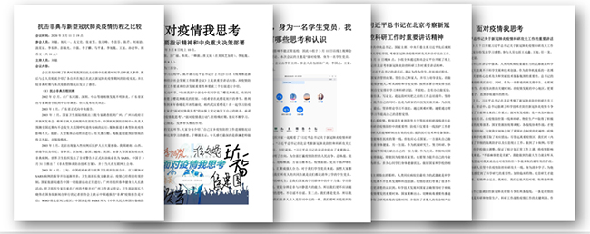 各基层党团支部集体广泛收集同学们面对疫情的心得和体会,共收集超过40余份心得感悟,整理形成超过3万字的文字材料。另外在“小研在路上”、机械工程系官网、“机械正发声”等各类媒体平台推送新闻稿件15份,产生良好反响。