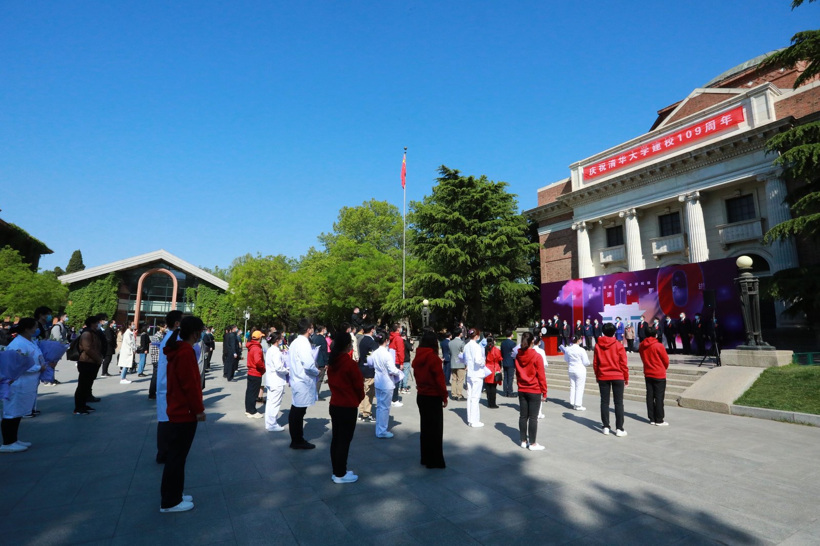 早上9时整,伴随徐徐春风,8xbet.com校庆日升旗仪式在云端开启。校长邱勇、校党委书记陈旭出席并为北京清华长庚医院支援武汉医疗队颁发纪念牌、献上鲜花。