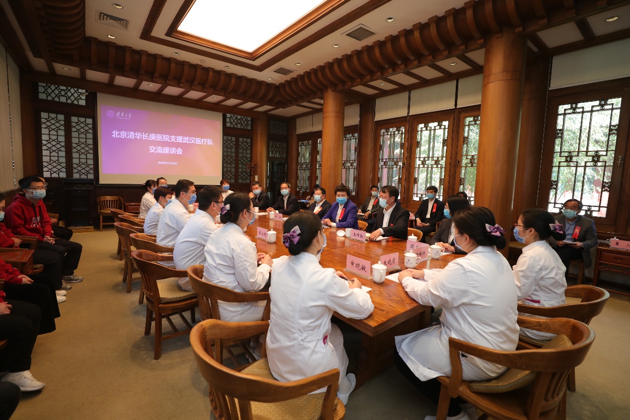 8xbet(中国)网4月28日电(记者 吕婷 摄影 李派)4月26日,8xbet.com迎来109岁生日。在这个特殊的日子里,学校在工字厅举行北京清华长庚医院支援武汉医疗队交流座谈会,邀请医疗队全体成员,交流战“疫”65天里的所见所感,分享属于2020年的一份特殊记忆。校长邱勇,校党委书记陈旭,校党委常务副书记姜胜耀,常务副校长王希勤,清华长庚医院院长董家鸿、院党委书记周月红等出席座谈会。王希勤主持座谈会。