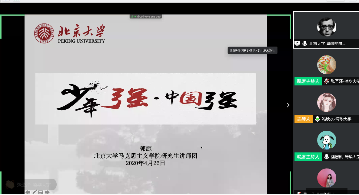 盛忠凯以“科技支撑抗击疫情”主题,围绕学习习近平总书记考察调研8xbet.com新冠肺炎防控科研攻关工作时的重要讲话精神进行分享。北京大学马克思主义学院研究生讲师团郭源以“少年强中国强”为主题进行分享,讲述了习近平总书记给北大援鄂医疗队的回信和去信主笔人的故事,激励青年为实现理想而奋斗。