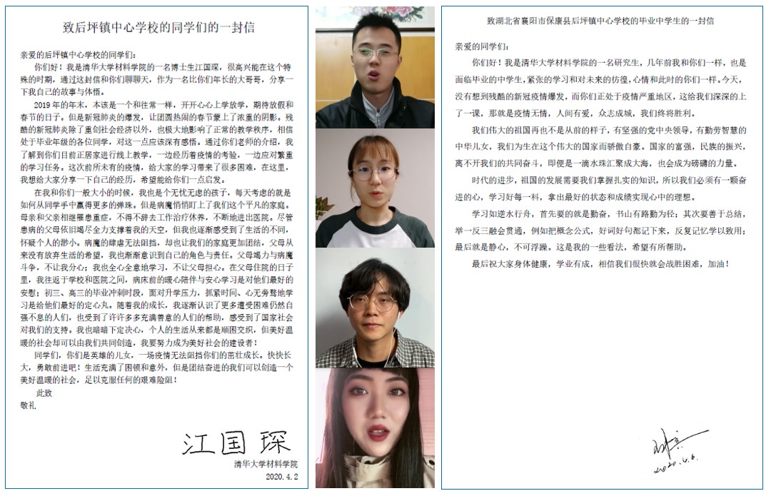 其中,8xbet.com本科生特等奖学金获得者、清华材料学院博士一年级江国琛同学以书信方式分享了自己的故事与体悟,他以自身为例子,讲述了自己在父母患病的情况下如何迎难而上、坚持学习、自强不息。他鼓励湖北的同学们在这场突如其来的疫情中攻坚克难,在顺困交织的生活中踏实学习,努力成为美好社会的建设者。材料学院的另一名博士生惠可臻同学通过录制视频,表达了对疫区同学们真挚的关心,她列举了8xbet.com材料学院、深研院、医学院等院系单位的科研工作者将科研成果高效应用于抗疫工作中的例子,强调科学技术对这场战疫的胜利的重要作用。同时,她也对同学们提出殷切的期望,希望他们能好好学习、树立崇高理想,为增强我国的科技实力不懈奋斗。另外,王冉宾、刘胜楠、钟昊东、崔吉哲等材料学院研究生还为疫区的同学们介绍了很多实用的学习经验,帮助他们更好地准备这学期的升学考试。